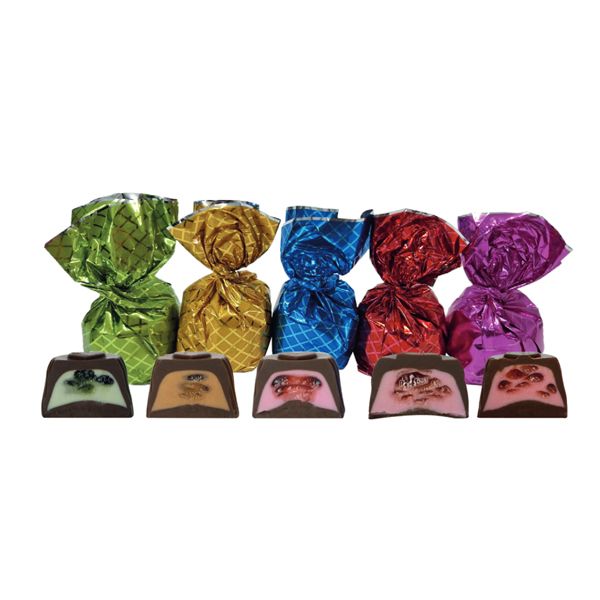 Конфеты ассорти, куполообразной формы в темной глазури с кремовыми фрукто-ягодными начинками -