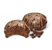 Бисквит круглой формы попарно склеен суфлейной начинкой, покрыт шоколадной глазурью и декорирован белой глазурью