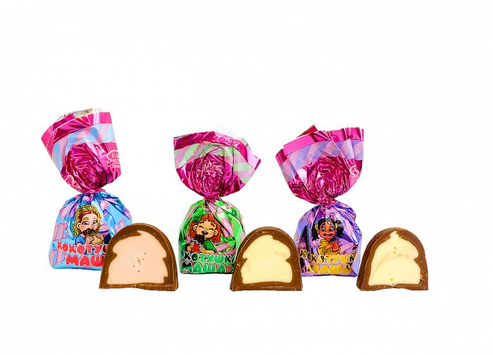 Конфеты купольной формы в фирменной молочной кондитерской глазури с нежной светлой начинкой с ароматами «Пина колада», «Тутти-фрутти», «Творожный сырок».