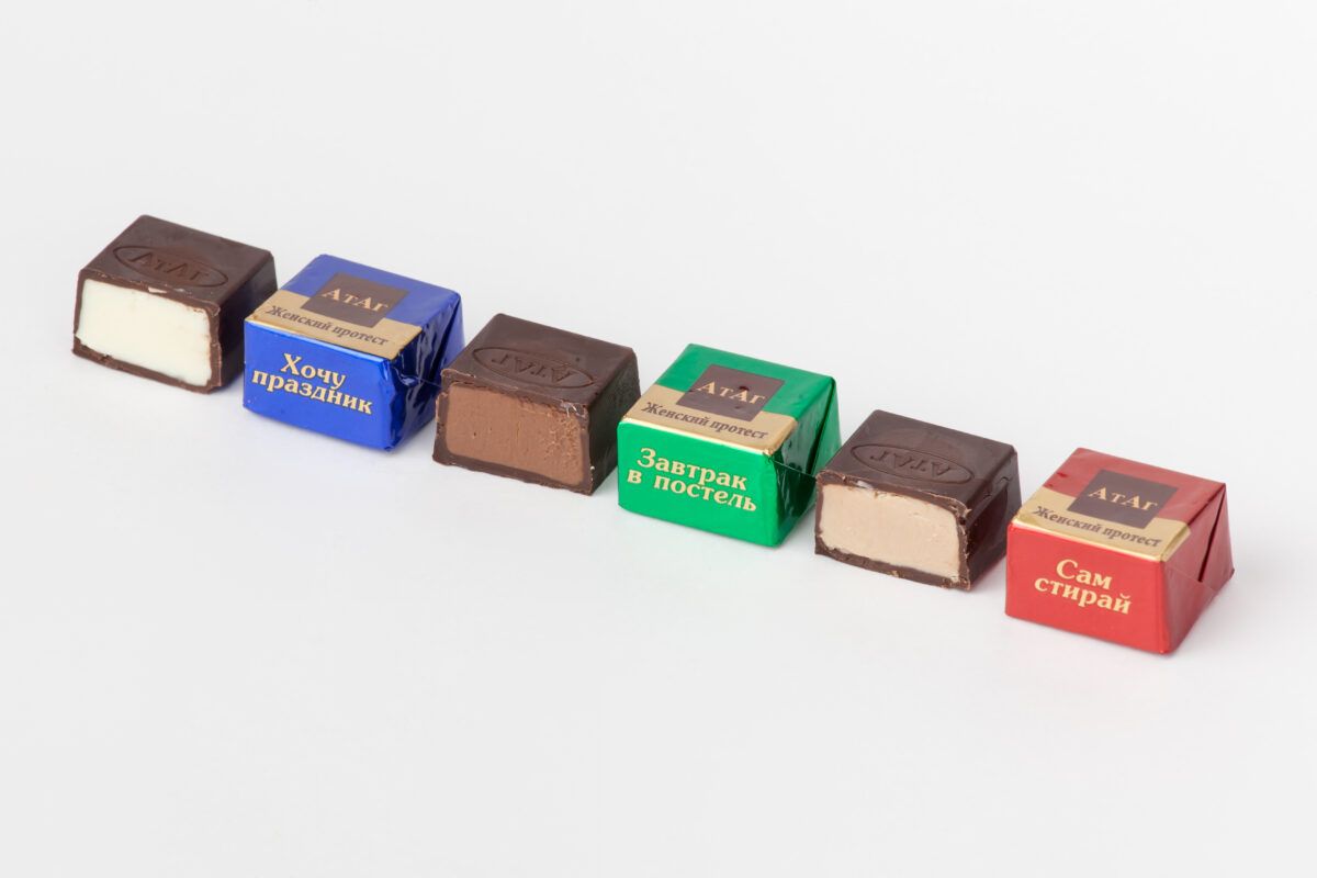 Конфеты в форме куба в кондитерской глазури с пралиновой начинкой со вкусами: «Арахисовая паста», «Фундук», «Кофе капучино», «Бейлиз».