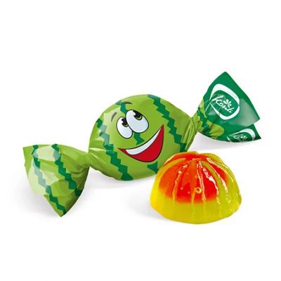 Яркая, сочная желейная конфета со вкусом ароматного арбуза с жидкой начинкой, сделана на основе природного загустителя каррагинана.