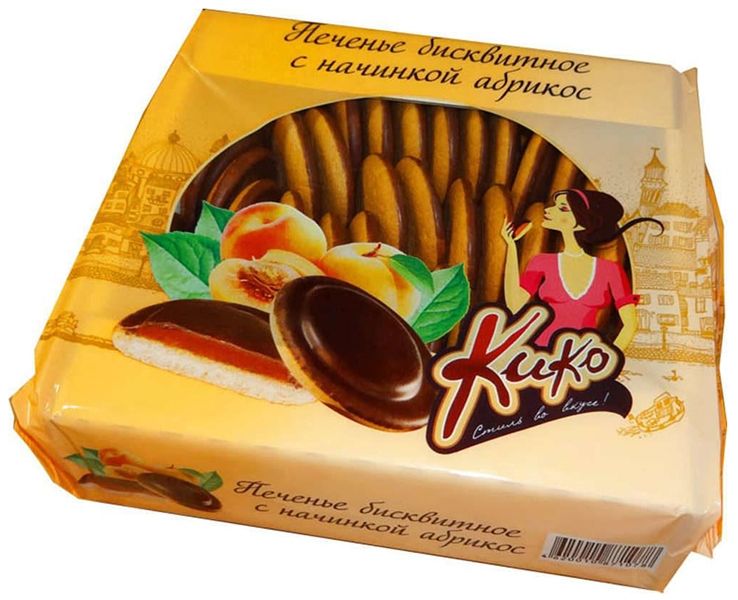 Бисквитное печенье с желейной начинкой со вкусом «Абрикоса», глазированное кондитерской глазурью.