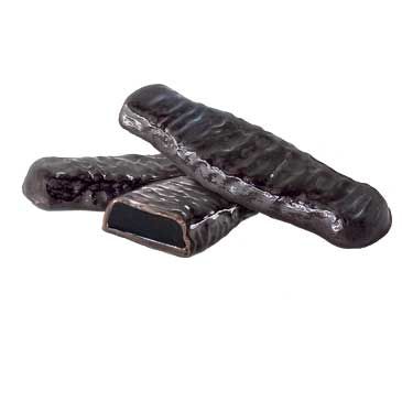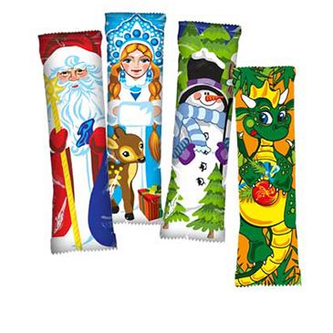 Длинные «язычки» с желейными фруктовыми начинками под тонким слоем шоколада упакованы в новогодний флоу-пак с изображением Снегурочки (апельсин), Деда Мороза (вишня), Снеговик (яблоко), Дракончик (кола).