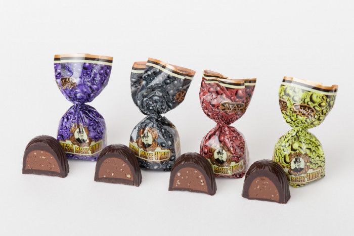 Конфеты куполообразной формы в кондитерской глазури с темной пралиновой начинкой и «взрывной» карамелью с натуральными вкусами: «Ром», «Бренди», «Коньяк», «Бэйлиз».